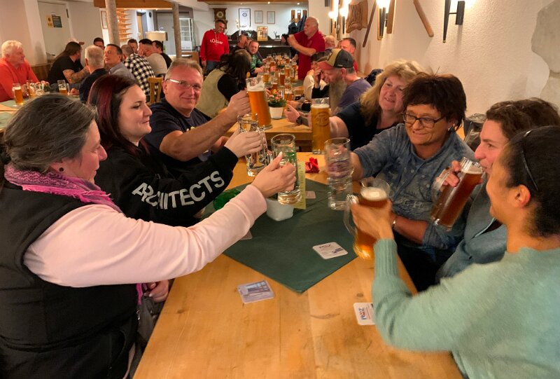 Nach pünktlichem Start um 19:00 Uhr in Waldthurn, Trasfeld und Vohenstrauß brachte unser Busfahrer Dominik die erwartungsvolle Gruppe trotz diverser Straßensperren rund um den Zielort sicher in das beschauliche Röthenbach. Kaum saßen die ausgehungerten Wirtshausfahrer auf ihren Stühlen und Bänken, stand schon der süffige Bier, gebraut in der Zoiglhochburg Windischeschenbach, auf den Tischen. Die Servicekräfte ließen hierbei keine Wünsche offen, auch das vorbestellte Essen – ob knuspriger Schweinshaxn, von Kraut begleitete Bratwürste, gut gewürzte Currywürste oder deftige Brotzeiten – wurde aus der vorzüglichen Küche schnell mit dem freundlichen Wunsch „An goudn Appetit!“ an den Mann und an die Frau gebracht, wobei sich manch einer nicht nur mit einer Mahlzeit zufrieden gab. Danach noch ein Verdauungsschnapserl oder als Krönung einen Eisbecher: Freunde der Kulinarik, was wollt ihr mehr?!